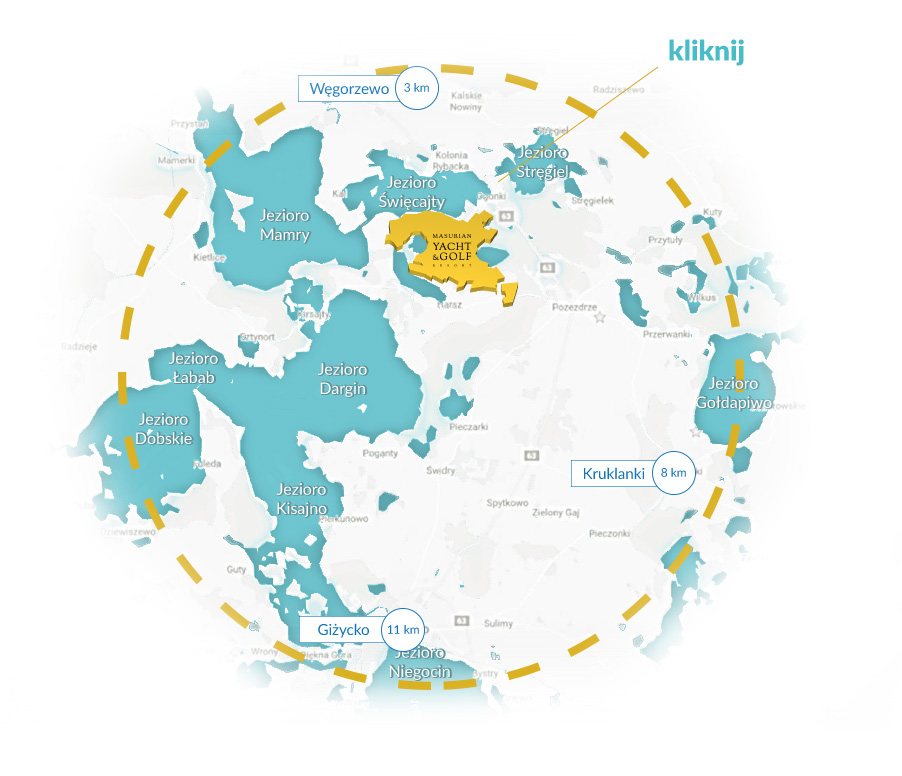 Masurian Yacht & Golf Resort znajduje pomiędzy Giżyckiem a Węgorzewem na szlaku Wielkich Jezior Mazurskich.